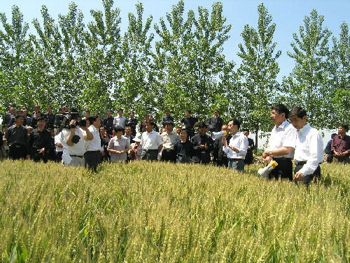 “眼下麦子已完成灌浆,如无特殊情况,今年我场小麦丰收已成定局。根据田间测产,全场小麦单产、总产纪录有望再次刷新,‘万亩千斤’小麦高产攻关目标将如期实现。”19日上午,在四分场大田,韩大鸣场长向来自蒙城县的200多名县乡领导介绍道。“到底是大农场,看这麦子长得,就是不一样。”前来观摩的人们交口称赞。副场长李先金拿起扬声器说道:“大家看到的就是具有抗倒、抗病、耐寒、高产、优质特点的泛麦5号,去年就是这个品种在我场拿了单产冠军,达1200斤,这块地,今年测产是亩产1300斤。”蒙城县副县长李星走进麦田,高声说道:“我们种的一些所谓传统品种,就是要由泛麦5号这样的优质品种来取代,从而提高我县的小麦产量和质量水平。”