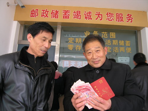 12月12日上午,潘村湖农场退休职工杨华峰(右)在当地邮政金融网点拿着存折和刚领取的养老金高兴地对在场的农场劳资部门负责同志说:“这下咱们领取养老金方便了,感谢组织上又为退休人员办了件大好事!”