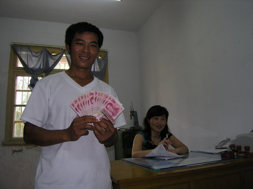 8月4日上午,潘村湖农场一分场职工谷忠明(左)从场财务科领到了2050元奖金。针对近年来夏大豆市场价格持续走低,耕地亩均收益较低,职工增收缓慢的情况,潘村湖农场不断加大农业结构调整力度,在巩固小麦种子粮生产的同时,以市场为导向,积极发展优质、高产、高效的调秋作物,促进职工增收,并将2006年确定为“结构调整年”,出台了一系列扶持和激励措施,在技术、资金和产品销售等方面给予支持。今年夏种期间,在场农技部门的指导下,谷忠明等几户家庭农场引进旱稻新品种在大田进行连片种植,预计亩均效益较种植大豆提高近一倍,为全场秋季作物结构调整起到了示范带动作用。根据场有关鼓励结构调整规定,农场按每亩50元的标准对结构调整示范户给予了奖励。