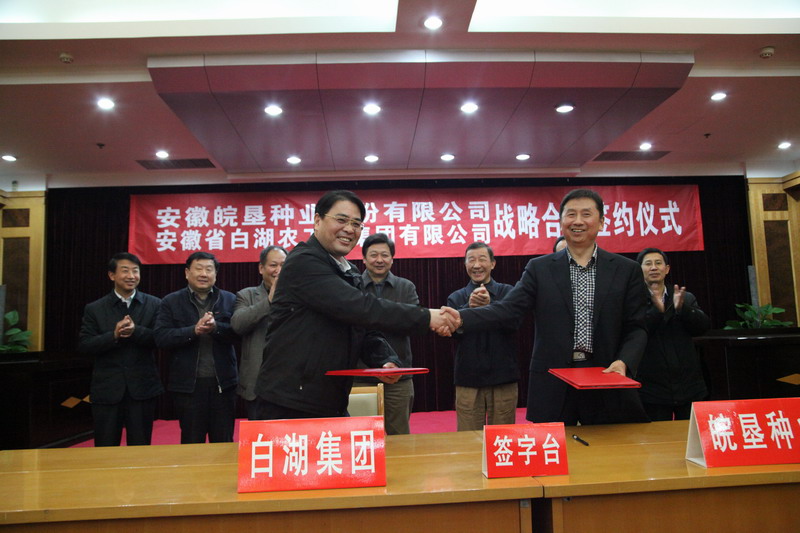 仪式上,皖垦种业总经理王占廷、白湖农工商董事长程志先分别代表各自在协议书上签字。双方表示,开展战略合作后,将架起合作的新桥梁,找到合作的最佳途径,不断开拓种业合作的深度和广度。 马梓耀