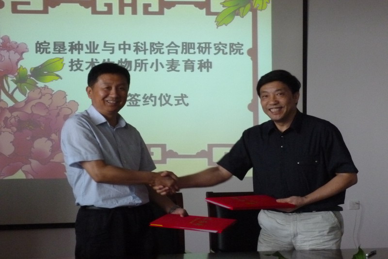签约前,吴跃进介绍了技术生物所的成立背景、基础与应用研究、项目合作和科研实力,他说,近年来,我们顺应国家在环境、农业等重大领域的发展战略需求,充分发挥多学科综合交叉优势,开发低能离子束并应用于农业、工业、环境等生物技术之中,围绕先进制造业和环境健康领域的战略性、基础性、前瞻性科学技术问题,他表示将通过科企合作,运用先进诱变技术,将实验室育种和田间育种相结合,为皖垦种业发展服务。王占廷介绍了皖垦种业基本情况,认为双方携手合作,有利于发挥产研各自优势,加速科技成果转化为现实生产力,他希望中科院合肥物质科研院能拿出一流科研人才、一流物质装备和核心竞争力,成为皖垦种业最优质的合作伙伴,通过几年深度合作,实现互利双赢、共同发展,研发出一批优质高产小麦新品种,助力安徽小麦育种和产业化发展。
